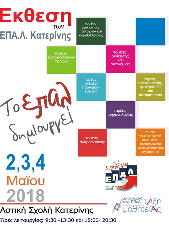 Η έκθεση των ΕΠΑ.Λ. της Κατερίνης ξεκίνησε την Τετάρτη 2 Μαΐου 2018 και θα βρίσκεται στο χώρο της Αστικής σχολής στη πόλη της Κατερίνης μέχρι και τη Παρασκευή 4 Μαΐου 2018 και ώρες 9:30 – 13:30 και 18:00 – 20:30.